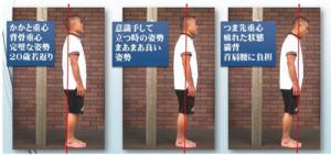重心位置がつま先にあると、バランスをとる為に頭が前に出て、猫背状態になります。